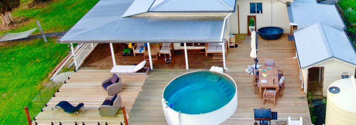 Discover the magic of Nimbin at our 180-acre estate, set in rolling green hills. Enjoy morning coffee on the sunlit deck, where wallabies graze and beautiful white cattle roam the surrounding pastures. Take in panoramic views or cool off in the natural spring water pool.
